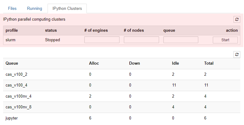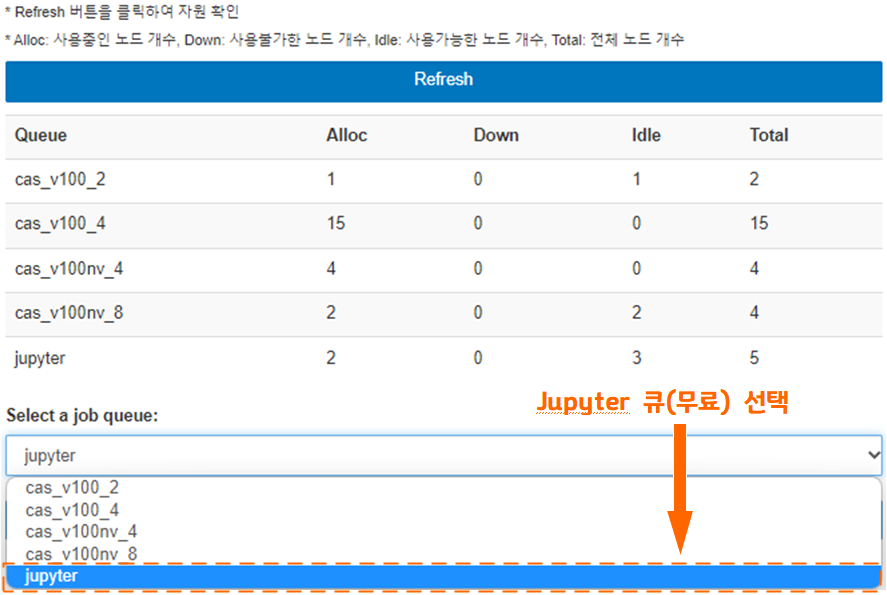 - Jupyter 실행 전 Refresh 버튼을 클릭하여 자원 현황을 확인