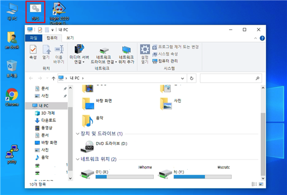 VM 접속이 완료되면 누리온 시스템의 home01과 scratch가 자동으로 마운트 되며 마운트가 되지 않거나 오류가 있을 경우 바탕화면의 NFS를 실행한다.