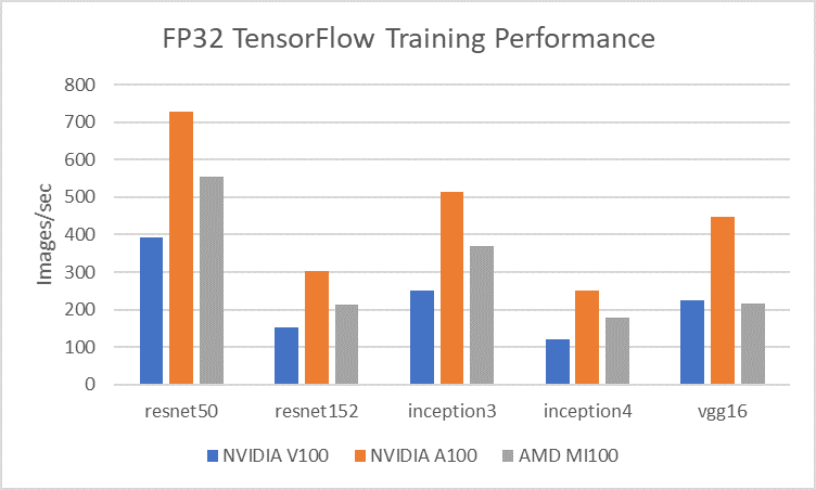 A100의 경우 Tensor Core에서 TF32 데이터 타입을 활용하므로 V100 대비 약 2배, MI100 대비 약 1.4배 정도 많은 이미지를 처리할 수 있었다.
