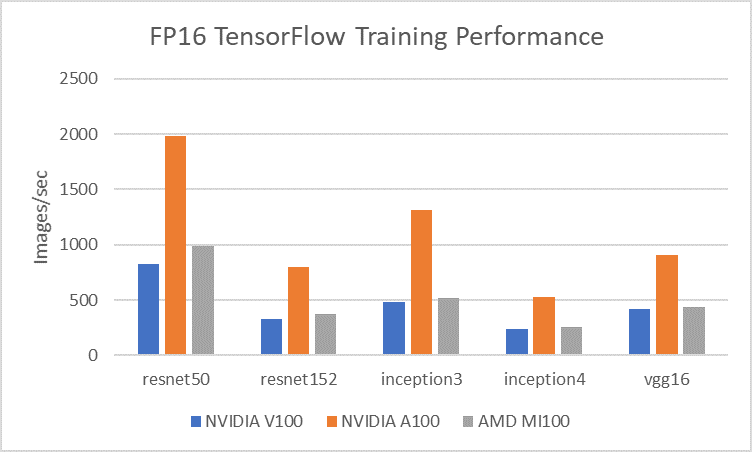 Tensor Core 및 Matrix Core FP16 기준 V100 (125 TFLOPs), A100 (312 TFLOPs), MI100 (184.6 TFLOPs)로 MI100이 V100 대비 높은 이론성능을 보이지만 GPU 구조, Instruction Set Architecture, deep learning 연산 라이브러리 (cuDNN, MIOpen), memory hierarchy 등 다양한 원인으로 인하여 V100과 MI100의 성능이 흡사하게 나오는 것으로 분석된다. Deep learning 연산 라이브러리의 경우 NVIDIA 역시 긴 시간에 거쳐 성능개선을 진행하였으므로 AMD의 MIOpen 또한 향후 개선여지가 남아있다고 분석할 수 있다.