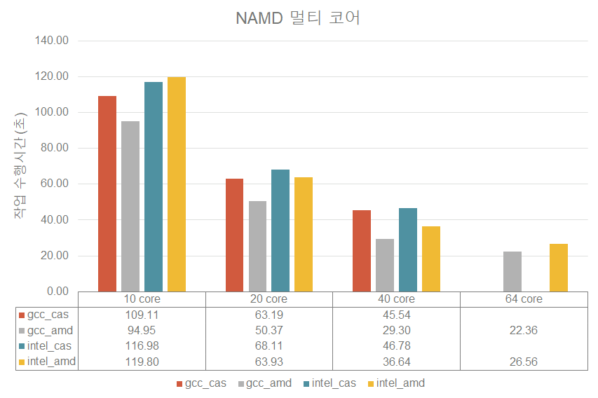 - 20 core 이후부터 gcc, intel 모두 AMD 노드에서 더 좋은 성능을 보여줌