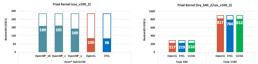 - OpenMP_18: intel/18.0.2 (icc), OpenMP_c: oneAPI-2021.3 (icc), OpenMP_x (icx), OpenCL (icx), SYCL (dpcpp)
