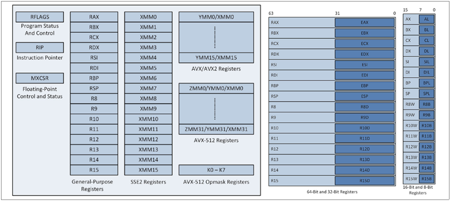 - x86_64 아키텍처의 레지스터는 다음과 같다. 자세한 것은 Intel 64 and IA-2 Architectures Software Developer's Manual 을 참고한다.